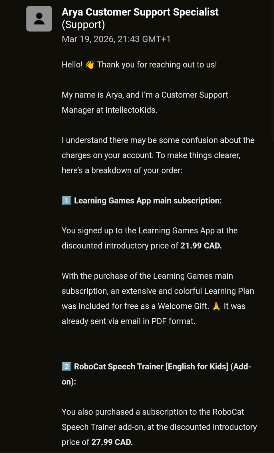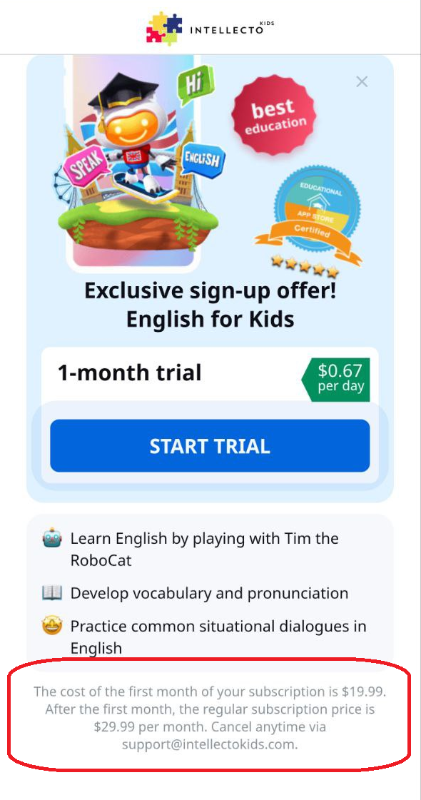 While subscribing to their app Learning Games, they sneaked in an "add on" called English for Kids. I specifically wanted to refuse all "add ons" and remember refusing both of them. However, after a single click, I was immediately charged 27.99 CAD for it, which was more than the price of the main subscription. Thus, my credit card was charged twice without ever seeing my "final package" and the total price. – I checked reviews, and many people had the same experience: double charges for undesired content.
